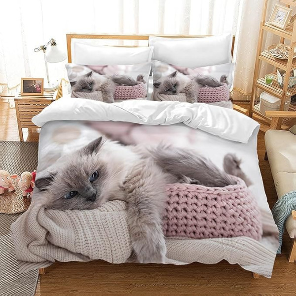 Kitten Bed Linen 135 x 200 cm Children's Bed Linen with Duvet Cover and 2 Pillowcases, 3D Cute Kitten Pattern, with Zip for Girls Boys Kitten A