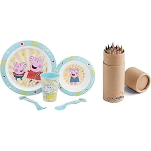Peppa George Cartoon Character Tableware Set, 5 Pieces, Plate, Bowl, Cup and Cutlery, BPA Free, Microwave Safe, Includes 12 Piece Half Size Pencil Set (Peppa)