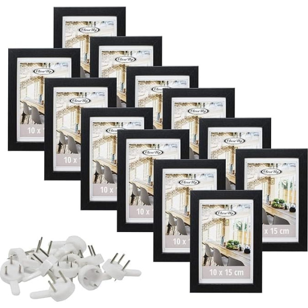 This black set of 12 picture frames in the format 10 x 15 cm perfectly shows photos, postcards or any kind of creativity Let your most beautiful and precious memories appear in a new shine and create an eye-catcher on any wall or shelf A sturdy MDF wooden frame with a shatter-proof plexiglass panel that reduces light reflections. This means that the picture frames also fit perfectly into the children's room. Includes practical hanger The photo frames have a sturdy stand mechanism so they can also be positioned and displayed individually in portrait or landscape format on a dresser, shelf or table Top design and excellent quality at an affordable price from Close Up Close Up with over 30 years of experience › See more product details; Product description Picture frame set 10 x 15 cm, black, 12 pieces MDF with plexiglass panel (unbreakable) 0.8 mm; Product description Picture frame set 10 x 15 cm, black, 12 pieces MDF with plexiglass panel (unbreakable) 0.8 mm; Picture frame set 10 x 15 cm, black, 12 pieces MDF with plexiglass panel (unbreakable) 0.8 mm