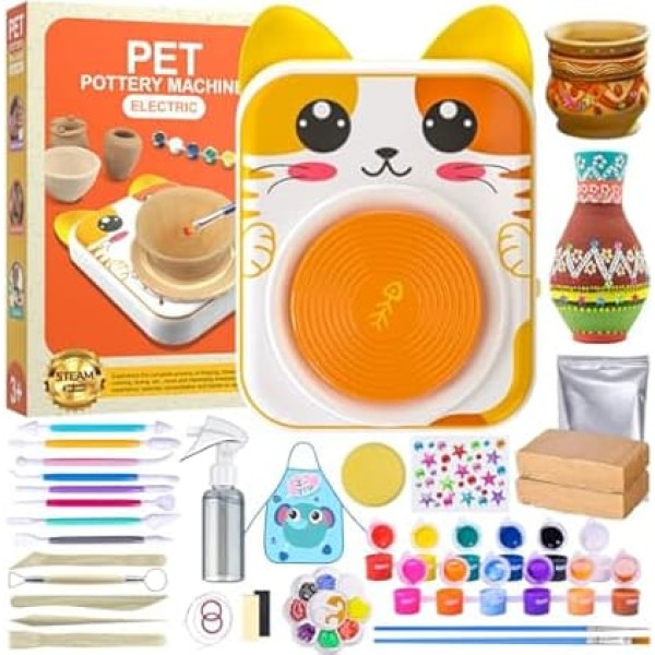 Pottery Set for Kids: Our pottery set for kids includes a pottery wheel in cute cat design, clay, apron and diamond stickers - everything little master pottery needs for their ceramic projects. This home pottery set is ideal for children who are just starting pottery and want to develop their creative skills. Perfect for getting started in the world of ceramics! DUAL SPEED CONTROL The potter's wheel offers two adjustable speeds that allow children to customize their way of working. This creative set for children is specially designed for children aged 6 and up and makes pottery an intuitive and fun experience. SAFE AND ECO FRIENDLY MATERIALS Pottery set for home uses safe and environmentally friendly materials, including clay that air dries so no burning furnaces are required. Children can live out their imagination with the creative set for children and create unique works of art. The materials are child-friendly and encourage creative development in a safe environment. Creative set for children: the potter's wheel is designed in cute cat design, which makes it particularly popular with children. With the removable turntable, cleaning after pottery is child's play. The children's pottery set also includes built-in paint wells, so little artists can easily paint and decorate their ceramics. This makes creative work with clay a highlight. Widely used: whether at home, school or in DIY workshops, this creative set for children is versatile and ideal for children aged 6 and over. The pottery set for home is not only a great leisure activity, but also an excellent tool to promote children's artistic development and craft skills. It is also perfect as a gift to awaken creativity and imagination. › See more product details