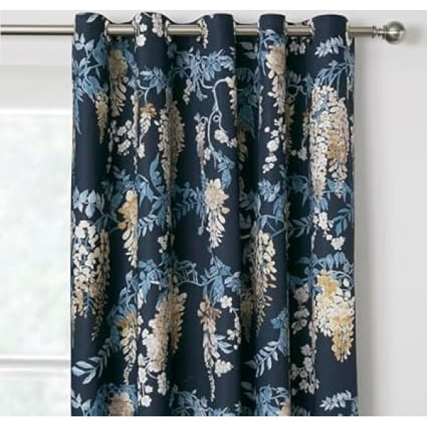 A gorgeous hand painted wisteria floral pattern cascades over a rich navy background on these stunning lined curtains. The curtains have been provided with grommets that are easy to install and draped beautifully. The Dreams & Drapes Curtains collection's premium heritage designs feature fine floral patterns and traditional prints that add a timeless sense of style to any room in the house. This curtain size is suitable for curtain rod width (140cm to 220cm) - 10 brushed silver grommet rings (40mm diameter) per curtain (2 panels per pack) Material: 100% BCI Cotton, Lining: 100% Polyester (Light Filtering) Care: dry clean only Package Includes:2 x Matching Curtains › See more product details; Product description Step into a world of timeless elegance with the Wisteria curtains from D&D Design. Delicately hand painted, the exquisite blue and gold wisteria floral print dances on a rich navy blue base, creating a tapestry of refined beauty. These curtains are carefully lined to filter the perfect amount of light and transform any room into an oasis of peace. Immerse yourself in the artistry of these curtains and know that every detail has been crafted with the utmost care. Let the wisteria curtains wrap your home with classic sophistication while offering exceptional value and coordinating options to create a polished, cohesive look.; Product description Step into a world of timeless elegance with the Wisteria curtains from D&D Design. Delicately hand painted, the exquisite blue and gold wisteria floral print dances on a rich navy blue base, creating a tapestry of refined beauty. These curtains are carefully lined to filter the perfect amount of light and transform any room into an oasis of peace. Immerse yourself in the artistry of these curtains and know that every detail has been crafted with the utmost care. Let the wisteria curtains wrap your home with classic sophistication while offering exceptional value and coordinating options to create a polished, cohesive look.; Step into a world of timeless elegance with the Wisteria curtains from D&D Design. Delicately hand painted, the exquisite blue and gold wisteria floral print dances on a rich navy blue base, creating a tapestry of refined beauty. These curtains are carefully lined to filter the perfect amount of light and transform any room into an oasis of peace. Immerse yourself in the artistry of these curtains and know that every detail has been crafted with the utmost care. Let the wisteria curtains wrap your home with classic sophistication while offering exceptional value and coordinating options to create a polished, cohesive look.