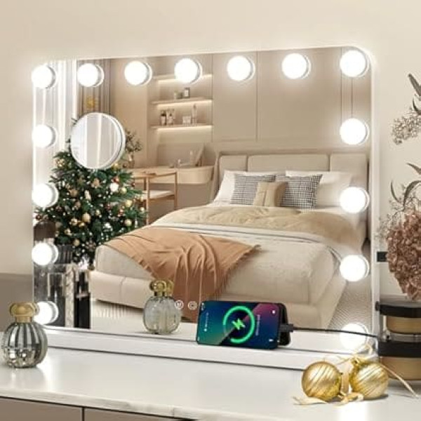 Perfect size: the illuminated Hollywood make-up mirror of 58 x 48 cm is equipped with a sturdy ferroalloy frame and a high-quality silver mirror and is large enough to be used in bedrooms, hairdressing salons, beauty salons, make-up rooms and much more. Natural and realistic image colours. USB charging: Our dressing table mirror is equipped with USB ports and allows you to conveniently charge your smartphone when applying make-up. In addition, the secure design with rounded corners reduces the risk of injury in the event of an accidental collision for added safety. 15 LED lamps, 3 colours: equipped with 15 durable and energy-efficient LED lamps, our LED make-up mirror offers 3 adjustable lighting modes: warm, cool and yellow light as well as adjustable brightness. You can easily adjust the colour temperature from 2500 K to 6500 K with a simple push of a button, so you can adjust the brightness and light to your needs to achieve a flawless look in any situation. 2 uses: our cosmetic mirror with USB port is both aesthetic and practical and can be used as a table mirror in the bedroom or as a wall mirror in the bathroom. The mirror base is removable and you can hang it securely on the wall using the two holes on the back of the mirror. Mirror with 10x magnification: each vanity mirror is equipped with a removable 10x magnifying mirror, which is perfect for the smallest make-up details, especially for eye make-up. It gives you a professional makeup experience at home and is suitable for girls and women of all ages. Easy installation: assemble your wall mirror with light in just 5-10 minutes using our clear instruction manual (English language not guaranteed). Whether it is a party or birthday gift for your daughter, mother or girlfriend, it is a thoughtful and practical choice. › See more product details