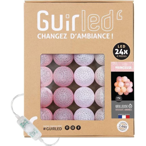 24 ultra-durable balls: Made of finely braided cotton and durable transparent plastic, for indoor use, diameter 6 cm, 4 colours (pink, glitter pink, baby pink, light pink). Decoration for a baby’s or child’s room, living room, entrance hall or patio. Creates a wonderful decoration for a really cosy and warm atmosphere. USB port: Dual USB 2 A power adaptor included; safe for children; high-performance LEDs; your garland can be connected to the Guirled external battery (sold separately) so you can place it anywhere; no more disposable batteries; consumption < 3 W; A +++ Variable intensity: 3 intensity levels (100% 50% – 25% with 2-hour night light timer – off). Assured intensity. Total length: 4 m (2.4 m balls). Intensive illumination and original light projections. Plug and Play system: Easy to install in seconds, recycled paper box, instructions printed on the box (English language not guaranteed), high-quality materials and beautiful surfaces Designed and assembled in France – the best of French decorative garlands. › See more product details