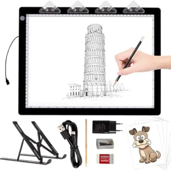 Contents: 1 x Super Bright A3 Pad, 1 x Light Pad Stand, 1 x 5 V2A UL-Certified Adapter, 4 x Clips, 1 x 1.8m Type-C Cable, 1 x Pencil, 1 x Pencil Sharpener, 1 x Eraser, 10 x Tracing Paper and 1 x User Manual (English language not guaranteed) Innovative design: This super bright tracing light box has a fixed cord for insertion. Connecting and disconnecting is much easier, and the built-in cable protects the integrity of the power system. This makes it much more robust and durable than micro USB. 3-level/infinitely adjustable brightness. Short press the button to select 3 brightness levels, or by long pressing the button to adjust the brightness continuously. The maximum brightness of the drawing light table reaches up to 8000 lux in the surface, which is a great tool for Cricut weed vinyl. Easy to carry, lightweight, super thin, only 0.5 cm, approx. 5 mm. Total dimensions including Frame is 42.2 x 32 cm, visual work area is 37.8 x 27.8 cm. Wide range of uses: The tracer light board is a great tool for diamond painting, weeding vinyl, stencilling, 2D animation, calligraphy, embroidery, scrapbooking, tattoo transfer, sketching and drawing, streaming, sewing projects, stained glass, quilting, etc. Best gifts for Christmas, birthday or other celebrations. Please note: This light box does not contain a battery. It only needs to work when plugged in. Not rechargeable. › See more product details