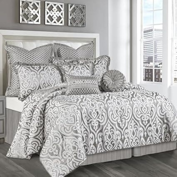 Glamorous Modern Comfort Set This modern jacquard comforter set features a silver grey striped base fabric that looks extremely metallic and textured, paired with a large damask pattern that exudes a relaxed, stylish and elegant comfort. This shiny and dazzling bedding set is the perfect choice for luxurious and lush home decor 9 PIECE SET - 1 Queen Comforter (90\; Product description Loom and Mill 9 Piece Modern Jacquard Comforter Set, Luxury Damask Bedding Set, Queen Size, Ultra Soft Comforter with Euro Shams, Bed Skirt, Filled Decorative Pillow for All Seasons (Silver Grey, Queen); Product description Loom and Mill 9 Piece Modern Jacquard Comforter Set, Luxury Damask Bedding Set, Queen Size, Ultra Soft Comforter with Euro Shams, Bed Skirt, Filled Decorative Pillow for All Seasons (Silver Grey, Queen); Loom and Mill 9 Piece Modern Jacquard Comforter Set, Luxury Damask Bedding Set, Queen Size, Ultra Soft Comforter with Euro Shams, Bed Skirt, Filled Decorative Pillow for All Seasons (Silver Grey, Queen)