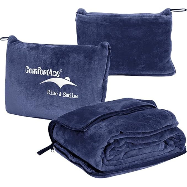 【2-in-1 Blanket and Pillow Design】Experience ultimate comfort with this dual-purpose travel blanket. It unfolds into a 90 x 150 cm cozy flannel blanket and transforms into a compact 33 x 25 cm pillow for added comfort. Innovative folding design: the additional pocket with zip allows the blanket to be seamlessly folded into a pillow. This feature ensures effortless storage and provides a neat, tidy look when not in use. Premium flannel material: made of ultra-soft flannel fabric, it offers exceptional comfort and warmth, ideal for long flights, road trips or lounging at home. Lightweight and portable: Designed to save space, this travel blanket is lightweight and compact, making it a must for any traveler who values convenience and comfort. Beware of the blanket cushion paradox: Some customers are at a loss that our travel blanket cannot be both at once. Consider it a gentle reminder to choose your cozy companion wisely. After all, magic also has its limitations. Machine washable at 30°C, vacuum packed, easy care. Note: This product cannot be used as a pillow while acting as a blanket. › See more product details; Product description The ComfortAce 2-in-1 Travel Blanket and Travel Pillow with Zipper, the ultimate accessory for your next adventure. Available in both navy and twilight grey, this multifunctional pillow features a dual purpose design that offers unparalleled comfort and adaptability. Our innovative fold-over design seamlessly transforms the 90 x 150 cm cozy flannel blanket into a compact 33 x 25 cm pillow that is included in an additional zip pocket. Made of high quality ultra soft flannel fabric, perfect for long flights, car trips or relaxing at home, providing exceptional warmth and comfort in both colors. Lightweight and portable, this travel blanket saves space and is a must for any traveler who values convenience. Easy care by machine wash at 30 °C and store in its vacuum packed form. Experience the ultimate travel comfort with the ComfortAce 2-in-1 Travel Blanket and Pillow.; Product description The ComfortAce 2-in-1 Travel Blanket and Travel Pillow with Zipper, the ultimate accessory for your next adventure. Available in both navy and twilight grey, this multifunctional pillow features a dual purpose design that offers unparalleled comfort and adaptability. Our innovative fold-over design seamlessly transforms the 90 x 150 cm cozy flannel blanket into a compact 33 x 25 cm pillow that is included in an additional zip pocket. Made of high quality ultra soft flannel fabric, perfect for long flights, car trips or relaxing at home, providing exceptional warmth and comfort in both colors. Lightweight and portable, this travel blanket saves space and is a must for any traveler who values convenience. Easy care by machine wash at 30 °C and store in its vacuum packed form. Experience the ultimate travel comfort with the ComfortAce 2-in-1 Travel Blanket and Pillow.; The ComfortAce 2-in-1 Travel Blanket and Travel Pillow with Zipper, the ultimate accessory for your next adventure. Available in both navy and twilight grey, this multifunctional pillow features a dual purpose design that offers unparalleled comfort and adaptability. Our innovative fold-over design seamlessly transforms the 90 x 150 cm cozy flannel blanket into a compact 33 x 25 cm pillow that is included in an additional zip pocket. Made of high quality ultra soft flannel fabric, perfect for long flights, car trips or relaxing at home, providing exceptional warmth and comfort in both colors. Lightweight and portable, this travel blanket saves space and is a must for any traveler who values convenience. Easy care by machine wash at 30 °C and store in its vacuum packed form. Experience the ultimate travel comfort with the ComfortAce 2-in-1 Travel Blanket and Pillow.