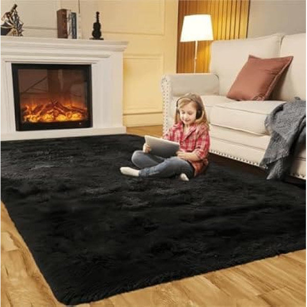 Rug Living Room Shaggy Rug High Pile Rug Long Pile Rug Children's Room Modern Batik Rug Teenager's Room Fluffy Rug (Black, 120 x 160 cm)