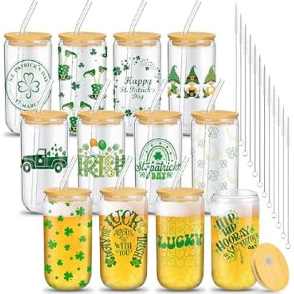 PRODUCT CONFIGURATION The St. Patrick's Day glass tumbler set includes 12 cups, 12 bamboo lids, 12 reusable glass straws and 12 straw cleaning brushes. They are easy to clean, but note that they must not be used in the dishwasher. Very practical combination suit and they will bring you a different festival experience Festival design: this lucky shamrock tumbler is very fashionable, aesthetic, and features vivid St. Patrick's Day design, the pattern printing is clear and vivid, and not easy to fade, printed with shamrock, iron hoof, elf and more patterns, which are sure to add some festive mood to your celebration and bring you good luck SUITABLE SIZE 16 oz St. Patrick's Day iced coffee cups have a good size coffee cups with lids, 2.75 inches in diameter and 5.9 inches in height; Easy to carry and use indoors or outdoors, crystal clear and durable Product Material The green cup and straw with Irish shamrocks are made of high quality glass material and the lid is made of bamboo, which can be used safely for a long time. And this water bottle is lightweight and easy to carry, suitable for outdoor activities, travel and picnics Wide Applications Our Irish shamrock cups are suitable for St. Patrick's Day, Irish holidays and other occasions. You can use them to make tea, iced coffee, milk tea, smoothie, fruit juice or other interesting festival drinks. You can also use them as wonderful festival gifts to delight your friends and guests about St. Patrick's Day and increase the festive atmosphere of St. Patrick's Day › See more product details; Product description Special features: These St. Patrick's Day glass cups with lids and straws are sure to add a festive cheer to your celebrations. Crafted with great attention to detail, these Happy St. Patrick's Day glass mugs bring joy and happiness with their classic St. Patrick's Day design and are printed with shamrock patterns, allowing you to make a statement while enjoying your favorite beverage. These mugs are characterized by their crystal-like clarity and versatility, making them an ideal gift for anyone who appreciates quality and style. Technical data: Material: Glass Color: as picture show Size: Diameter: 7 cm. Height: 15 cm. 16 oz capacity Quantity:12pcs Package includes: 12 x Cups 12 x Bamboo Lids 12 x Reusable Glass Straws 12 x Straw Cleaning Brushes Notes: Manual measurement, please allow slight errors on size. The color may exist slight difference due to different displays.; Product description Special features: These St. Patrick's Day glass cups with lids and straws are sure to add a festive cheer to your celebrations. Crafted with great attention to detail, these Happy St. Patrick's Day glass mugs bring joy and happiness with their classic St. Patrick's Day design and are printed with shamrock patterns, allowing you to make a statement while enjoying your favorite beverage. These mugs are characterized by their crystal-like clarity and versatility, making them an ideal gift for anyone who appreciates quality and style. Technical data: Material: Glass Color: as picture show Size: Diameter: 7 cm. Height: 15 cm. 16 oz capacity Quantity:12pcs Package includes: 12 x Cups 12 x Bamboo Lids 12 x Reusable Glass Straws 12 x Straw Cleaning Brushes Notes: Manual measurement, please allow slight errors on size. The color may exist slight difference due to different displays.; Special features: These St. Patrick's Day glass cups with lids and straws are sure to add a festive cheer to your celebrations. Crafted with great attention to detail, these Happy St. Patrick's Day glass mugs bring joy and happiness with their classic St. Patrick's Day design and are printed with shamrock patterns, allowing you to make a statement while enjoying your favorite beverage. These mugs are characterized by their crystal-like clarity and versatility, making them an ideal gift for anyone who appreciates quality and style. Technical data: Material: Glass Color: as picture show Size: Diameter: 7 cm. Height: 15 cm. 16 oz capacity Quantity:12pcs Package includes: 12 x Cups 12 x Bamboo Lids 12 x Reusable Glass Straws 12 x Straw Cleaning Brushes Notes: Manual measurement, please allow slight errors on size. The color may exist slight difference due to different displays.