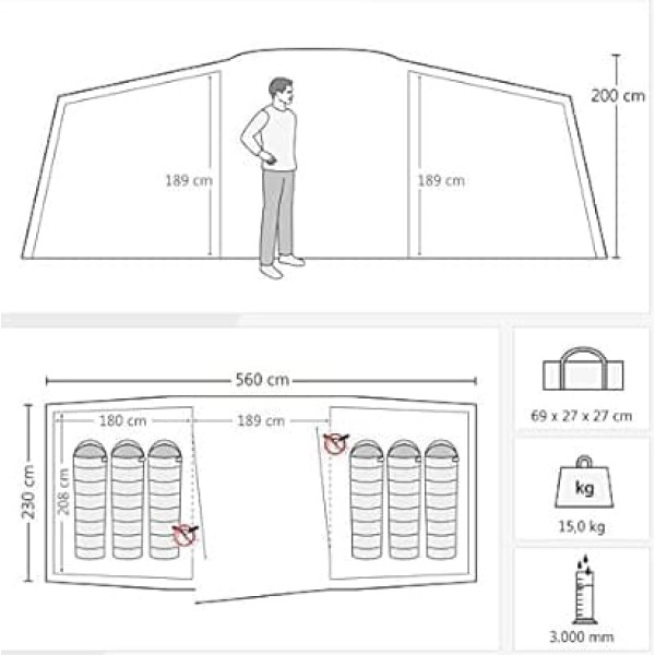 Family tent for up to 6 people with 2 sleeping cabins facing each other (vis-à-vis). Living area in the tent measuring approx. 5 m² (with standing height). Continuous ventilation in the roof and sleeping cabins with a mosquito net. Waterproof camping tent thanks to a water column of 3,000 mm. Firmly sewn-in base. Sturdy tunnel tent construction features a large entrance area with an optional canopy. Tent cones with a storage bag, pegs (robust) and a repair kit. › See more product details