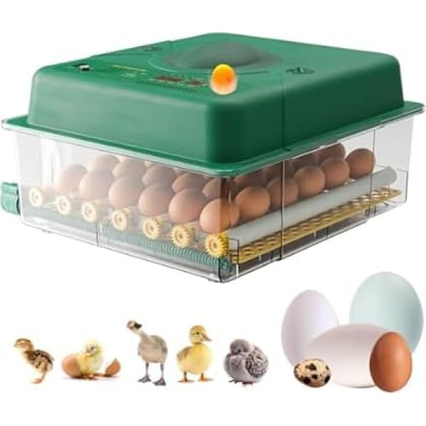 Automatic Egg Turning - The incubator automatically turns eggs every 90 minutes, eliminating the need for manual turning of eggs, ensuring even heat distribution and higher hatching success. The roller spacing is adjustable to accommodate eggs of different sizes, suitable for chicken, duck, goose and quail eggs. Temperature control - The display continuously shows the current temperature in the device. Precise temperature control via buttons on the panel, easy to use. The incubator has built-in alarms that alert you when the temperature deviates from the set range. So the operation is easy for both beginners and experienced users. Humidity monitor - humidity display and low humidity alarm. The humidification function is achieved by manually adding water to the bottle. If necessary, open the lid to quickly reduce humidity. Versatile - With 4 preset breeding modes and a constant temperature mode, the incubator is designed for hatching chicken, duck, goose, quail, pigeon eggs, etc. (The temperature can only be set in constant temperature mode.) Ideal for home use, farm, school or industry. Schierlampe - Monitor egg development easily with the built-in LED light. No additional tools required to observe embryo growth. DOUBLE POWER SUPPLY - The incubator supports both 220V AC and DC 12V, ensuring uninterrupted incubation even in case of power failure. › See more product details