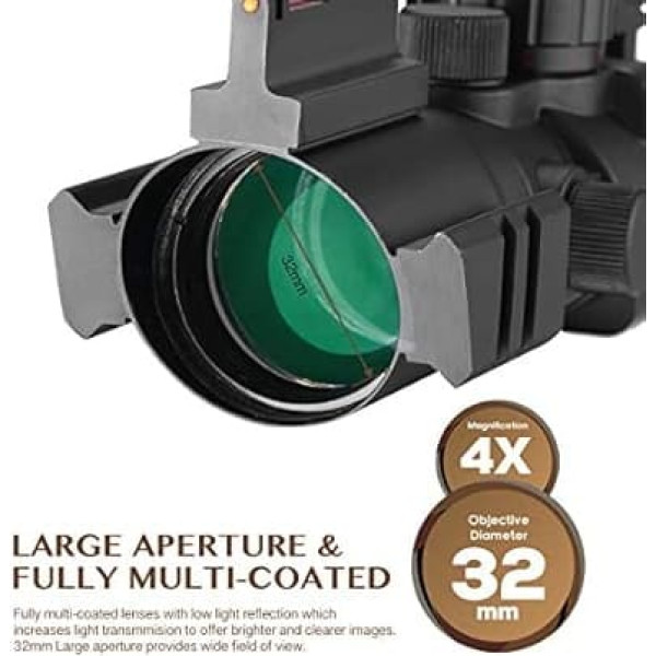 Riflescopes for 10 mm to 11 mm and 20 mm to 22 mm weaver and picatinny rail, hexagon socket (Allen key) and mounting for mounting included. Two rail systems on two sides of the objective lens, you can screw in other accessories such as red dot sight or torch. High-quality optics: 4x magnification, 32 mm lens, 36.6 ft field of view in 100 metres, 5.5 inch length. Multi-coated (FMC) green objective lens with UV filtering and anti-reflective coating, provides high light transmission and clear sharp images. REFLECTIVE SIDE: Airsoft Red Dot Scope with red and green illuminated reticle provides unlimited eye relief and corrected parallax. It helps you to target your goal well in the dark environment. Equipped with fibreoptic visor for quick detection Accurate targets: you can determine a straight line through the rear sight and the two sides of the Fiberoptic. The height fine drive and side fine drive realise the reticle adjustment and can target the target accurately. Made of high quality aluminum and nitrogen filled, the Rifle Scope is sturdy, shockproof, fogproof and waterproof. › See more product details