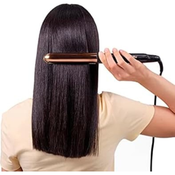 ULTIMATE STYLING VARIETY - This hair straightener provides both straightening and curling with heated plates on the outer housing, allowing you to effortlessly create smooth, shiny hair or soft, curls and waves like firsch by the hairdresser. SMOOTHING TITANE PLATES - With 28mm polished genuine titanium plates, this straightener ensures effortless glide and styling in just one stroke with long-lasting results. Quick heating - Thanks to the Advanced Ceramics heating system, this straightener heats up in just 15 seconds and maintains an even temperature for even styling in every strand of hair. Individually adjustable temperature levels - 5 temperature settings, including a high heating option up to 235°C, allow you to choose the perfect temperature for the respective hair type and ensure optimal results every time. Ion anti-frizz technology - The ultra-smooth stainless steel housing helps control frizz and leaves hair smooth, shiny and frizz-free all day long. › See more product details; Product description Product Description Professional 2-in-1 salon straightener for silky, smooth results or long-lasting curl styles. Hair straighteners with high quality True Titanium coated plates for extra straight salon hair The rounded, heated stainless steel outer plates create glamorous curls and waves. The extra long plates allow larger hair areas to be straightened for super fast results on all hair types. Provides shine and suppleness thanks to ion technology with anti-frizz effect. Precise temperature control with 5 levels: 150°C - 230°C and Advanced Ceramics heating system for even, constant heat distribution. Directions 1. Apply a protective agent to the hair before use. 2. Connect the device. 3. Set the desired temperature. 4. Wait for the device to reach the selected temperature. 5. Use the device on the hair to straighten or curl. 6. Allow the device to cool before storing it in the included heat-resistant bag. Safety Warning No risk of burns: removable thumb rest See more; Product description Product Description Professional 2-in-1 salon straightener for silky, smooth results or long-lasting curl styles. Hair straighteners with high quality True Titanium coated plates for extra straight salon hair The rounded, heated stainless steel outer plates create glamorous curls and waves. The extra long plates allow larger hair areas to be straightened for super fast results on all hair types. Provides shine and suppleness thanks to ion technology with anti-frizz effect. Precise temperature control with 5 levels: 150°C - 230°C and Advanced Ceramics heating system for even, constant heat distribution. Directions 1. Apply a protective agent to the hair before use. 2. Connect the device. 3. Set the desired temperature. 4. Wait for the device to reach the selected temperature. 5. Use the device on the hair to straighten or curl. 6. Allow the device to cool before storing it in the included heat-resistant bag. Safety Warning No risk of burns: removable thumb rest See more; Product Description Professional 2-in-1 salon straightener for silky, smooth results or long-lasting curl styles. Hair straighteners with high quality True Titanium coated plates for extra straight salon hair The rounded, heated stainless steel outer plates create glamorous curls and waves. The extra long plates allow larger hair areas to be straightened for super fast results on all hair types. Provides shine and suppleness thanks to ion technology with anti-frizz effect. Precise temperature control with 5 levels: 150°C - 230°C and Advanced Ceramics heating system for even, constant heat distribution. Directions 1. Apply a protective agent to the hair before use. 2. Connect the device. 3. Set the desired temperature. 4. Wait for the device to reach the selected temperature. 5. Use the device on the hair to straighten or curl. 6. Allow the device to cool before storing it in the included heat-resistant bag. Safety Warning No risk of burns: removable thumb rest See more