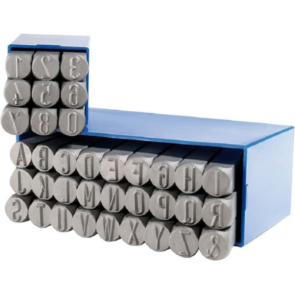 Suitable for labelling workpieces with a strength of 600-800 N/mm² Font height 10 mm / stamp size 12 x 12 x 80 mm / print readable Typeface according to DIN 1451 (medium) / hardness at engraving: 58-61 HRC No side grinding on the engraving (no visible edge) Each stamp is marked with: visual engraving, font height, \
