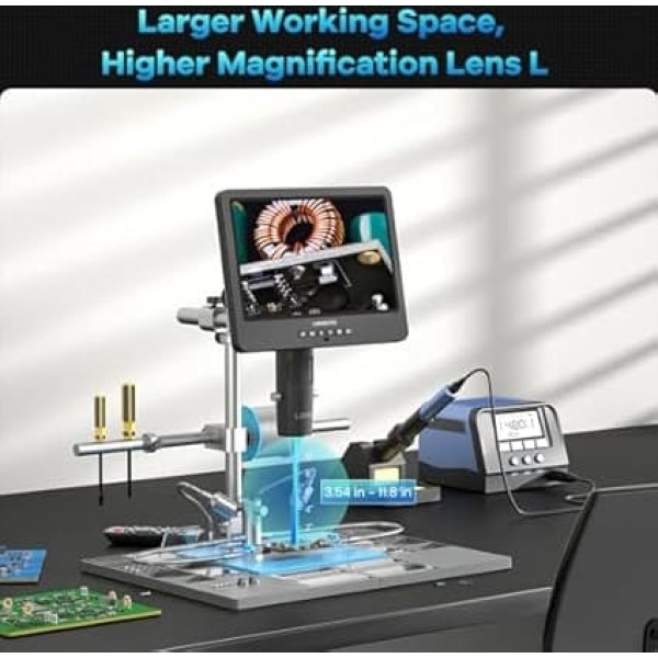 The latest upgrade in 2024, LM249MS PLUS with welding workbench, updates the bracket kit based on the original LM249MS and provides space for applying heat resistant soldering mats, soldering assisting hands, tool holder, making the digital microscope more comprehensive and your workbench no longer get messy. Multi-purpose lens with 3 lenses in one, it switches the 3 microscope lens: welding lens L (240X), digital lens A (720X), microbial lens D (2040X). Soldering Microscope, Coin Microscope and Biological Microscope Set --- Three forces in one, more than just a helper for welding work, it brings more fun to exploration Universal 13 inch boom arm stand equipped with the newly upgraded stands for soldering digital microscopes that have a boom arm (Size:7 x 7.8 x 13 inch, 45 mm). More than just a higher column and a larger base, the retractable arms allow for more work surface! UHD 2160P video microscope 10.1 inch IPS screen, 178 wide viewing angle, supports ultra high definition 2160P videos and 1080P photo output. No lag, great picture quality and true-to-life colour formation. HDMI and USB output for larger viewing. Connect the LINKMICRO HDMI microscope to an external monitor or PC with HDMI or USB interface to get a larger field of view, plug and play, better finish for presentations or live streaming. Professional assistant for electronic repair. Professional telephoto lens L can reach 240x. With 13 inch boom stand, which simultaneously provides sufficient working space and large magnification. 0402 SMD resistor are clearly available. Best choice for coin collector lens. A LM249MS digital microscope can fully capture a coin. With the improved stand object distance up to 13 inches. Dime, penny, nickel, quarter, dollar, even the big silver dollar, it's easy to get the entire coin view. Captured images can be saved as photos and videos to share with others. High magnification microbial lens Not only a tool for soldering and coin collectors, it can easily turn into a home laboratory. An observation table with a ground light source, prepared slides, an insect box and tweezers are included. The versatile microscope lens D has a high magnification 2040X, suitable for cell level observation, slides observation. Explore the micro world with your little one in leisure time! › See more product details