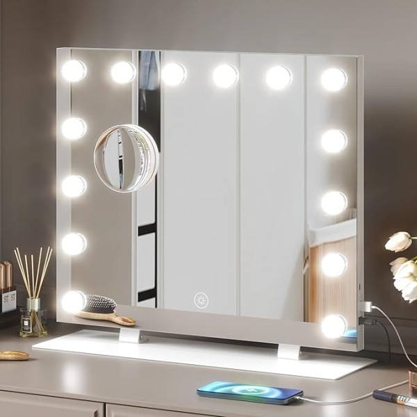Mondeer Make-Up Mirror with Lighting, 60 x 50 cm Hollywood Mirror with 14 LEDs, Dimmable, 3 Colour Temperatures, Light Memory Function, USB Type C Charging, Table Top or Wall Mount Makeup Mirror