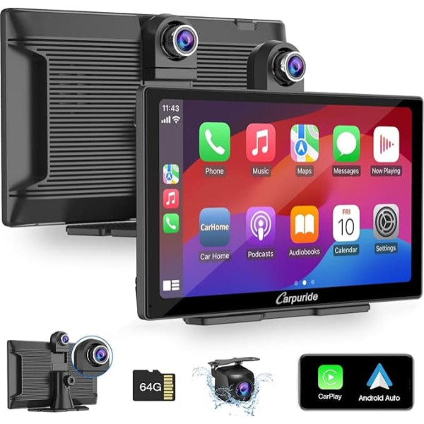 Note: Please use the original Carpuride car charger, otherwise the device may burn out! Wireless carplay and Android car with voice control: The Carpuride W905 portable car radio compatible with Apple CarPlay and Android car. It features the latest voice control technology and allows you to access map navigation, phone calls, email, music, notifications and more using Siri or G00gle Assistant. By connecting to your smartphone, you can free your hands, focus on the road and drive safely. Improved Bluetooth audio output: Carpuride 9-inch wireless car play display for Apple offers an improved Bluetooth audio output option that supports CarPlay and Android Auto and allows a seamless connection to the car's Bluetooth for phone calls. In addition, you can also enjoy audio playback via the car speakers using the built-in 4Ω3W speaker, AUX or FM transmission function. 【4K Front & Rear Camera Dual Dash Cam】: The Carplay car screen with 4K HD front camera + 1080p rear camera, supports loop recording and HD night vision. The dual dash cam records simultaneously and ensures a wide field of view for safe, clear and accurate recording of your ride. You can adjust the camera vertically to adapt it to the installation of your car, and rotate it 350° to record the scenes in the car and easily watch children in the back seat. 9 inch HD touch screen and Bluetooth 5.0: Carpuride Cars Carplay for Apple, equipped with 9 inch HD touch screen with a resolution of 1024 x 600 and supports 1080P video playback, you can enjoy more large screen displays and responsive touch functions, including 64GB TF card. With Bluetooth 5.0 enabled for wireless hands-free calling and audio streaming when paired with your smartphone. (Note: Not compatible with Netflix, HuLu, Pandora and other apps.) 【IOS/Android Mirror Link】: Car Play for Apple supports Airplay and Android Cast Mirror Link, seamlessly syncs audio, video and app content from your phone in real time with the Carplay screen, providing larger viewing space and improved functionality. Compatible with most IOS/Android smartphones, IOS: Airplay wireless mirror link, for iPhone 6 and above, Android: AutoLink wireless mirror link, for Android 11 or above Android phones. 【Sensor Light Design & Customized Trunk Logo】: The sensor light is specially designed to protect your eyes when driving. When you drive through or exit a tunnel, the sensor light automatically adjusts the brightness of the display to prevent eye fatigue and ensure optimal vision. We also offer customizations for the boot logo and screen. 【Adjustable Bracket & Easy Installation】: Portable carplay screen has two adjustable brackets that can be attached to your dashboard or windshield, have a full 360° rotation and swivel function, and can be easily adjusted to the perfect viewing angle according to your personal viewing habits, no need to disassemble the console of the car, plug and play, can save a lot of installation costs. 【Compatible with most models】: Carpuride car radio with 5V, 2.5A type C plug and cigarette lighter, also powered by a high-speed USB charger, but the power must be up to (5V2.5A/5V3A). Or the carplay screen may automatically shut off because the power is not enough. And the voltage range of the car from 12-24V is suitable for almost all cars, RVs, SUVs, pickups and trucks, regardless of year and model. Carpuride series is not compatible with polarised glasses: The Carpuride car radio series is not compatible with polarised glasses and is not glare-free. If you use polarised glasses when driving, please buy an anti-glare protective film in suitable sizes to prevent the screen from turning black and affecting vision. 【Products Included】: Package includes: 1 x car radio, 2 x adjustable bracket, 1 x car charger, 1 x user manual. Show More › See more product details