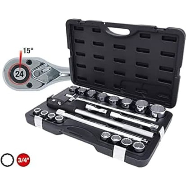 The socket set includes a large selection of 3/4 inch 12-point sockets, as well as 3/4 inch socket extensions and other socket wrench accessories A reversible ratchet (3/4 inch) with push-button quick release function on the ratchet head, 24-tooth ratchet mechanism Ideal for the professional as a car tool in the workshop or for the ambitious craftsman as a screwing tool during maintenance Stable and firm connection between nuts, extensions and ratchet Secure hold of all individual parts in a sturdy plastic case 12-sided FlankTraction profile › See more product details