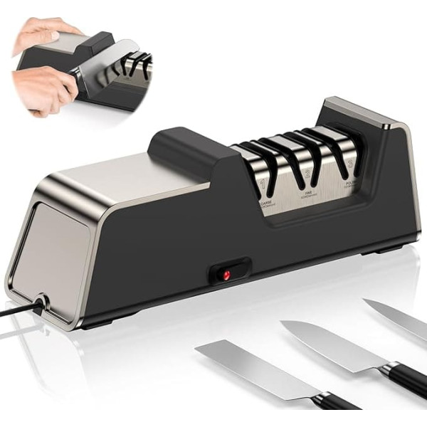 Efficient electric knife sharpener: Three sections with functions for coarse grinding, fine grinding and polishing. Using 100% diamond abrasives, sharpening and grinding levels 1 and 2 the edges efficiently. Level 3 uses resin polishing wheels and finishes the blade, restores your knife to a like-new state. You will get a razor sharp blade in seconds. High-quality diamond abrasive: This electric knife sharpener for kitchen knives uses a proprietary diamond abrasive, the hardest natural substance, for quick and effortless sharpening of edges. Sharpen kitchen and sports knives quickly and economically to a razor sharp edge. Professional and safe: the double-layer protection of the housing colour and electroplating, the beautiful and unique appearance design, the powerful motor and the noise reduction design have made the electric knife sharpener. The professional electric knife sharpener has a 15 degree angle guide function and a flexible spring rail, which can automatically adjust the sharpening angle and control precisely. User-friendly operation: Our professional knife sharpener has a 230 V AC motor, which ensures stable performance without overheating. Simply insert the blunt knife at an angle and pull it from the outside to the inside. Sharpen each slot 2-5 times to effortlessly restore the sharpness of your knife. Wide application: suitable for several types of straight blade knives (cold cuts, chef's knives, ceramic knives, paring knives, etc.). There is a magnetic dust drawer at the bottom to collect knife chips. The electric knife sharpener perfectly meets the needs of household knives. › See more product details