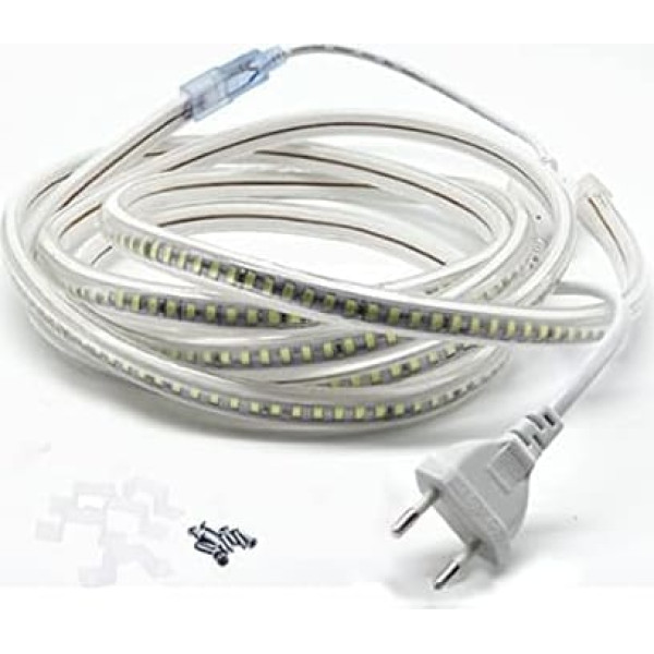 LED strips: 2835 SMD, 144 LEDs/m, 900 lm per metre, width 15 mm, very bright lighting, good flexibility Warm light effect: Warm white 3000 Kelvin light, input voltage 220 V, cut every 1 m (in marked intervals). Plug and play: Just plug it in, and it works; screws and fixed buckles are included, will not fall off; Directions for use: Application: perfect decoration lighting for home, kitchen, bedroom, counter, shopping mall, bar, Christmas, holiday party decoration. Weather resistant (LED part). the LED strips defy unpleasant weather, and are also protected against water splashes. This is due to the plastic coating. So it's suitable for both indoor and outdoor use. But pay attention: Both ends, as well as the wiring, must be either installed inside or protected. Do not completely immerse the strip in water. › See more product details; Product description Technical specifications: Dimensions: selected length x 1.5 cm (W) x 0.9 cm (H). Cut every 100 cm (in marked intervals). Working input voltage: 220 V – 240 V. LED type: 2835 SMD. Number of LEDs: 144 LEDs per metre. Lumens: 900 lm per metre. Use: 7 Watt per metre. Light colour: Warm white. Dimmable: No. Self-adhesive: Not self-adhesive. Please note: Only the LED part is IP65 waterproof (IP65 means protected against water splashes from all directions). Do not completely immerse the strip in water. Package contents: 1 x LED strip. 1 x attachment clips.; Product description Technical specifications: Dimensions: selected length x 1.5 cm (W) x 0.9 cm (H). Cut every 100 cm (in marked intervals). Working input voltage: 220 V – 240 V. LED type: 2835 SMD. Number of LEDs: 144 LEDs per metre. Lumens: 900 lm per metre. Use: 7 Watt per metre. Light colour: Warm white. Dimmable: No. Self-adhesive: Not self-adhesive. Please note: Only the LED part is IP65 waterproof (IP65 means protected against water splashes from all directions). Do not completely immerse the strip in water. Package contents: 1 x LED strip. 1 x attachment clips.; Technical specifications: Dimensions: selected length x 1.5 cm (W) x 0.9 cm (H). Cut every 100 cm (in marked intervals). Working input voltage: 220 V – 240 V. LED type: 2835 SMD. Number of LEDs: 144 LEDs per metre. Lumens: 900 lm per metre. Use: 7 Watt per metre. Light colour: Warm white. Dimmable: No. Self-adhesive: Not self-adhesive. Please note: Only the LED part is IP65 waterproof (IP65 means protected against water splashes from all directions). Do not completely immerse the strip in water. Package contents: 1 x LED strip. 1 x attachment clips.