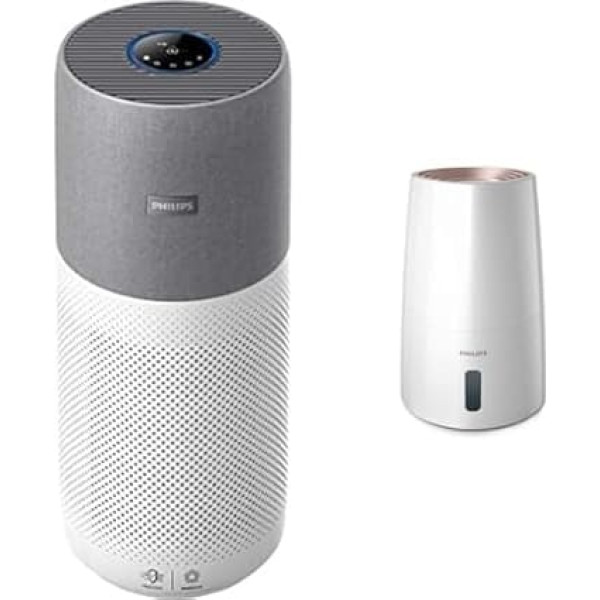 Product 1: Fresher air: air purifier up to 158 m² with 4 speed settings and sleep mode - three-layer filter with NanoProtect HEPA removes 99.97% of particles up to 0.003 µm (PM2.5, bacteria, viruses, pet hair)* Product 1: Sensors detect air quality: the air purifier shows the air quality in real time - automatic mode selects the optimal setting - cleans the air in a 20 m² room in under 5 minutes** Product 1: Ultra-quiet sleep mode: ideal air purifier for the bedroom, with dimming function and almost silent at night - improves air quality and provides the whole family with safe, clean air Product 1: Everything under control at all times: connect to your air purifier with air filter via our smart home app to be notified immediately in case of poor air quality Product 2: Breathe deeply: Natural NanoCloud evaporation process ensures a clean mist without heating the water - spreads 99% fewer germs than leading ultrasonic humidifiers* Product 2: Control it yourself: 3 speed settings for humidification up to 300 ml/h in medium-sized rooms up to 45 m² – thanks to sleep mode, this modern Philips humidifier is also suitable for the bedroom Product 2: Avoids wet spots, white dust and impurities: ultra-fine evaporation ensures invisible water mist and less pollution of the air Product 2: Easy to use: choose one of three humidity levels, your humidifier will automatically turn on and off - with real-time feedback on humidity, level, timer and modes › See more product details