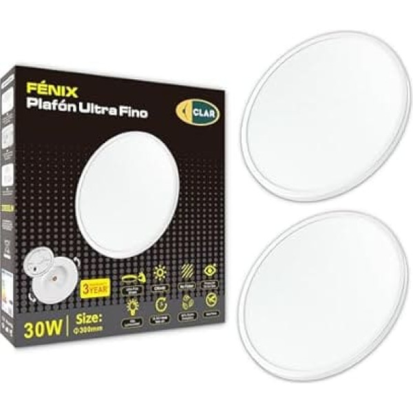 Modern and ultra-thin design: the CLAR LED ceiling light is characterised by its thin and elegant design that adapts perfectly to any environment and gives the rooms a touch of modernity and sophistication. Perfect for domestic use, such as bathrooms, living rooms and kitchens, or for commercial environments and offices that require warm, efficient and high-quality lighting. Easy installation: installing our spotlights is a breeze. Just follow a few simple steps to install the ceiling spotlights in minutes without the need for professional help. The easy installation makes the installation of our spotlights accessible to everyone. Energy efficient: our LED spotlights are an energy-efficient option. They consume much less energy than traditional light sources and save up to 85% on your electricity bill. As a result, the annual electricity costs due to the LED lighting of our spotlights can reduce from 10 to 150 euros. Durable: The CLAR LED ceiling light is designed for a long service life, reduces maintenance and guarantees a reliable and durable investment. Guaranteed customer service: If you have any concerns or problems with your order, our customer service team is at your disposal to solve them as soon as possible and ensure customer satisfaction. 30 years of experience and excellent customer service: With three decades of experience in living room lighting, we have been striving to provide our customers with high-quality lighting solutions and exceptional service since 1994. › See more product details; Product description The 30 W diameter 300 mm slim LED ceiling light combines light output, elegant design and energy efficiency in a single product. With an ultra-thin design of only 21 mm thick, this ceiling light can be easily integrated into any room and provides a modern, minimalist style. It offers a luminous flux of 3000 lumens and thus ensures brilliant, homogeneous and natural lighting. Ideal for homes, offices or commercial spaces, this ceiling light is a versatile solution that improves light quality while reducing power consumption. The slim design not only makes it aesthetically pleasing, but also practical and allows for quick and easy installation. In addition, energy efficiency and long service life reduce environmental impact and maintenance costs. For even more safety, this LED ceiling light comes with a 3-year warranty that ensures you get a reliable, long-lasting lighting solution.; Product description The 30 W diameter 300 mm slim LED ceiling light combines light output, elegant design and energy efficiency in a single product. With an ultra-thin design of only 21 mm thick, this ceiling light can be easily integrated into any room and provides a modern, minimalist style. It offers a luminous flux of 3000 lumens and thus ensures brilliant, homogeneous and natural lighting. Ideal for homes, offices or commercial spaces, this ceiling light is a versatile solution that improves light quality while reducing power consumption. The slim design not only makes it aesthetically pleasing, but also practical and allows for quick and easy installation. In addition, energy efficiency and long service life reduce environmental impact and maintenance costs. For even more safety, this LED ceiling light comes with a 3-year warranty that ensures you get a reliable, long-lasting lighting solution.; The 30 W diameter 300 mm slim LED ceiling light combines light output, elegant design and energy efficiency in a single product. With an ultra-thin design of only 21 mm thick, this ceiling light can be easily integrated into any room and provides a modern, minimalist style. It offers a luminous flux of 3000 lumens and thus ensures brilliant, homogeneous and natural lighting. Ideal for homes, offices or commercial spaces, this ceiling light is a versatile solution that improves light quality while reducing power consumption. The slim design not only makes it aesthetically pleasing, but also practical and allows for quick and easy installation. In addition, energy efficiency and long service life reduce environmental impact and maintenance costs. For even more safety, this LED ceiling light comes with a 3-year warranty that ensures you get a reliable, long-lasting lighting solution.