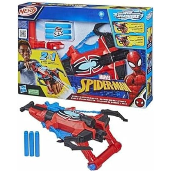 Nerf Blaster: when Spidey senses and Nerf power are combined, fans can look forward to ultimate and action-packed fun - whether indoors or outdoors 2 game variants: defeat imaginary opponents with Nerf darts and fill the 2-in-1 blaster with water to provide extra action Marvel design: with the Dart & Splash Nerf blaster in the look of Marvel's iconic Spider-Man, young heroes can stage exciting web slingshot adventures A great gift for Spider-Man fans: Spider-Man fans can surprise imaginary opponents with darts and water and slip into the role of the web-slinging wall crawler and superhero Even more Spider-Man Web Splashers toys: Hasbro's Web Splashers range offers more Spider-Man toys for even more water fun (each sold separately. while stocks last) Halloween as a Marvel hero: The Spider Man Nerf Blaster is a real eye-catcher as part of a Marvel costume for children on Halloween › See more product details; Product description Product Description With the Dart & Splash Blaster, two worlds meet each other. Here, Nerf and Spider-Man unite to create an epic toy that fires both darts and splashes water. Young heroes can keep their opponents at a distance with Nerf darts and activate the water jet function at the touch of a button. So children can slip into the role of the classic Marvel superhero and swing nets in no time! The Spider-Man Dart & Splash Nerf Blaster offers double the fun and encourages the imagination of young superheroes by combining action-packed adventures with two ways to play. Whether in the garden, on the beach or indoors, the blaster provides lots of fun and exciting duels. It is the perfect gift for Marvel and Nerf fans aged 5 and up and a great addition to any collection. Copyright 2023 Marvel. Hasbro and all related terms are trademarks of Hasbro. Safety Warning Suitable for ages 5 and up. Warning: small parts may be produced. Warning: Do not aim at eyes or face.; Product description Product Description With the Dart & Splash Blaster, two worlds meet each other. Here, Nerf and Spider-Man unite to create an epic toy that fires both darts and splashes water. Young heroes can keep their opponents at a distance with Nerf darts and activate the water jet function at the touch of a button. So children can slip into the role of the classic Marvel superhero and swing nets in no time! The Spider-Man Dart & Splash Nerf Blaster offers double the fun and encourages the imagination of young superheroes by combining action-packed adventures with two ways to play. Whether in the garden, on the beach or indoors, the blaster provides lots of fun and exciting duels. It is the perfect gift for Marvel and Nerf fans aged 5 and up and a great addition to any collection. Copyright 2023 Marvel. Hasbro and all related terms are trademarks of Hasbro. Safety Warning Suitable for ages 5 and up. Warning: small parts may be produced. Warning: Do not aim at eyes or face.; Product Description With the Dart & Splash Blaster, two worlds meet each other. Here, Nerf and Spider-Man unite to create an epic toy that fires both darts and splashes water. Young heroes can keep their opponents at a distance with Nerf darts and activate the water jet function at the touch of a button. So children can slip into the role of the classic Marvel superhero and swing nets in no time! The Spider-Man Dart & Splash Nerf Blaster offers double the fun and encourages the imagination of young superheroes by combining action-packed adventures with two ways to play. Whether in the garden, on the beach or indoors, the blaster provides lots of fun and exciting duels. It is the perfect gift for Marvel and Nerf fans aged 5 and up and a great addition to any collection. Copyright 2023 Marvel. Hasbro and all related terms are trademarks of Hasbro. Safety Warning Suitable for ages 5 and up. Warning: small parts may be produced. Warning: Do not aim at eyes or face.