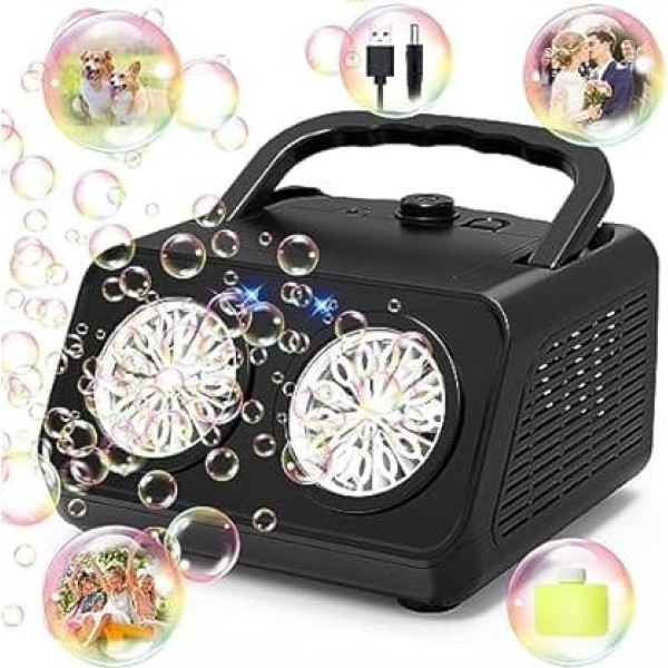 [High production 20000+ bubbles per minute] 2023 upgrade of the bubble machine with powerful double motor/26 holes bubbles, can produce about 20000+ colour bubbles per minute. More interesting with two modes, press the button once, bubbles are generated on one side to get 10000+ bubbles, press twice, bubbles come from both sides to get 20000+ bubbles, you can create fantastic bubble worlds for children, have fun in bubble play. [High Quality Material, Closed Container] When choosing the material for this bubble machine for children, we use high-quality and durable ABS material, a smooth surface without sharp edges, very friendly for children over 3 years old to play comfortably. Leak-proof design with an independent container for solution, no worry about the leakage of the solution or dirty children to enjoy happy bubbles on the road. [Flexible power supply, easy to use] The professional bubble machine supports power supply with 4 x AA batteries (not included) and the USB cable (included), providing maximum convenience indoors and outdoors. It adopts one-button operation, fully automatic, no diving, a button to start, a large number of constantly ejected bubbles, a bubble machine to have fun anywhere. Adjustable, bright lights: The lightweight design and portable allow children to take the electric bubble blower to the park, garden or anywhere. The two built-in LED lights make the bubbles colourful and add visual charm even at night. Suitable for, friendly service: Bubble toys are a great mood manufacturer for birthday party, wedding, patio, beach, swimming pool, camping games and other events in the room, also it is a cool gift for children, bring unlimited fun, expands interest in the room, enriches children's imagination and improves coordination. › See more product details