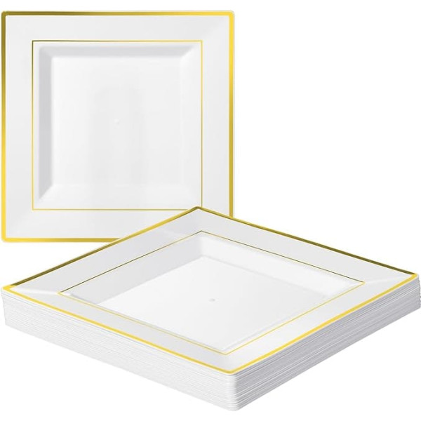 PREMIUM QUALITY: Enjoy the sophistication of our premium white square plastic plates with a stunning golden rim. Made from high quality materials, these reusable plates are designed to elevate any event. ELEGANT AND ROBUST: Impress your guests with the elegant design of these dining plates, which feature a golden rim that adds a touch of luxury to your table setting. Their sturdy build ensures that they can carry a variety of dishes without bending or breaking. Reusable: these party plates are not only beautiful, but also environmentally friendly. They are reusable making them an excellent choice for reducing waste on your special occasions. For easy cleaning, they are dishwasher safe, but we recommend hand washing to maintain the elegant golden rim for repeated use. VERSATILE APPLICATION Whether it's a wedding, birthday, Christmas party, baby shower, christening, formal event, family party, BBQ, garden party, picnic or any other occasion - these square plastic plates are versatile and suitable for all your entertainment needs. CONVENIENT SIZE: Each square plate measures 24 cm and provides ample space for your delicious culinary creations. Add a touch of elegance to your dining experience with these exquisite dining plates and make your event unforgettable. › See more product details; Product description Introducing our set of 100 premium white square plastic plates with gold trim, the perfect addition to your next special occasion. Add a touch of sophistication to your dining experience with these elegant and durable plastic plates that combine timeless style with modern convenience. Crafted with great care, these square plates feature a stunning golden rim that will add a touch of elegance to your table setting. Made from high quality materials, they are designed to withstand the demands of any event and ensure that your guests can enjoy their meals without worry. For easy cleaning, our plates are dishwasher safe. However, to maintain the elegant golden edge and preserve its flawless appearance, we recommend hand washing. With a convenient size of 24 cm, these party plates provide ample space for your culinary creations, making them ideal for a variety of occasions. Whether you are hosting a wedding, birthday, Christmas party, baby shower, christening, formal event, family gathering, barbecue party, garden party, picnic or any other special event, these plates will exceed your expectations.; Product description Introducing our set of 100 premium white square plastic plates with gold trim, the perfect addition to your next special occasion. Add a touch of sophistication to your dining experience with these elegant and durable plastic plates that combine timeless style with modern convenience. Crafted with great care, these square plates feature a stunning golden rim that will add a touch of elegance to your table setting. Made from high quality materials, they are designed to withstand the demands of any event and ensure that your guests can enjoy their meals without worry. For easy cleaning, our plates are dishwasher safe. However, to maintain the elegant golden edge and preserve its flawless appearance, we recommend hand washing. With a convenient size of 24 cm, these party plates provide ample space for your culinary creations, making them ideal for a variety of occasions. Whether you are hosting a wedding, birthday, Christmas party, baby shower, christening, formal event, family gathering, barbecue party, garden party, picnic or any other special event, these plates will exceed your expectations.; Introducing our set of 100 premium white square plastic plates with gold trim, the perfect addition to your next special occasion. Add a touch of sophistication to your dining experience with these elegant and durable plastic plates that combine timeless style with modern convenience. Crafted with great care, these square plates feature a stunning golden rim that will add a touch of elegance to your table setting. Made from high quality materials, they are designed to withstand the demands of any event and ensure that your guests can enjoy their meals without worry. For easy cleaning, our plates are dishwasher safe. However, to maintain the elegant golden edge and preserve its flawless appearance, we recommend hand washing. With a convenient size of 24 cm, these party plates provide ample space for your culinary creations, making them ideal for a variety of occasions. Whether you are hosting a wedding, birthday, Christmas party, baby shower, christening, formal event, family gathering, barbecue party, garden party, picnic or any other special event, these plates will exceed your expectations.