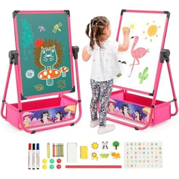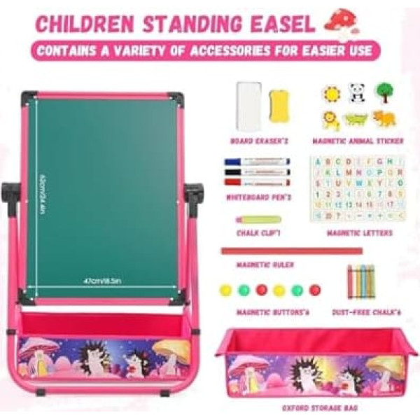 Kids Easel Iron Double Sided Whiteboard and Blackboard with Storage Bag and Stickers, Foldable Drawing Board, Height Adjustable, Metal Chalkboard for Boys and Girls