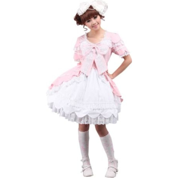 Antaina Pink and White Cotton Ruffle Bow Tie Sweet Victorian Knee-Length Elegant Lolita Cosplay Dress, L, multicoloured