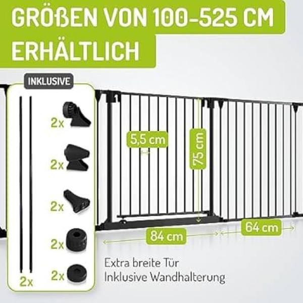 BOMI Milo Stair Protection up to 525 cm Extra Wide Door: 75 cm Passage 90° Stop Closes Automatically Mesh Door Made of Metal Black Sturdy Baby Safety Gate Door for Child Safety Door Gate