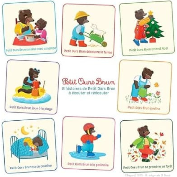 Great stories from the Little Brown Bear in a storyteller that you can take anywhere Children can listen to the story themselves: just twist, press and listen! 100% suitable for toddlers from 12 months, no waves and no privacy screen An ideal audio play to promote the imagination, hearing and attention span of the little ones 30 minutes of stories to listen to again and again › See more product details; Product description Product Description ODI is the audio player specially designed for toddlers. With its 8 stories of the Little Brown Bear, children won't get tired of hearing them over and over again. Experience a magical moment together with your child by rediscovering the most beautiful stories of the Little Brown Bear. Nothing easier than this: turn the voter to the story of your choice, and press the button to play it. This non-screen radio play is ideal for encouraging little one's imagination, hearing and attention. With Little Brown Bear, children can discover the world around them. The little brown bear takes the little ones on big and small adventures. With 8 stories that last about 30 minutes in total, the little furry companion of the little ones experiences lots of adventures. Stories included: 1- Little brown bear discovers the farm, 2- Little brown bear cooks with his dad, 3- Little brown bear plays on the beach, 4- Little brown bear goes to bed, 5- Little brown bear goes to the rink, 6- Little brown bear takes a walk in the forest, 7- Little brown bear gardens, 8- Little brown bear gardens. waiting Christmas Safety Warning Clean with a damp cloth. Do not use detergents or chemical solutions.; Product description Product Description ODI is the audio player specially designed for toddlers. With its 8 stories of the Little Brown Bear, children won't get tired of hearing them over and over again. Experience a magical moment together with your child by rediscovering the most beautiful stories of the Little Brown Bear. Nothing easier than this: turn the voter to the story of your choice, and press the button to play it. This non-screen radio play is ideal for encouraging little one's imagination, hearing and attention. With Little Brown Bear, children can discover the world around them. The little brown bear takes the little ones on big and small adventures. With 8 stories that last about 30 minutes in total, the little furry companion of the little ones experiences lots of adventures. Stories included: 1- Little brown bear discovers the farm, 2- Little brown bear cooks with his dad, 3- Little brown bear plays on the beach, 4- Little brown bear goes to bed, 5- Little brown bear goes to the rink, 6- Little brown bear takes a walk in the forest, 7- Little brown bear gardens, 8- Little brown bear gardens. waiting Christmas Safety Warning Clean with a damp cloth. Do not use detergents or chemical solutions.; Product Description ODI is the audio player specially designed for toddlers. With its 8 stories of the Little Brown Bear, children won't get tired of hearing them over and over again. Experience a magical moment together with your child by rediscovering the most beautiful stories of the Little Brown Bear. Nothing easier than this: turn the voter to the story of your choice, and press the button to play it. This non-screen radio play is ideal for encouraging little one's imagination, hearing and attention. With Little Brown Bear, children can discover the world around them. The little brown bear takes the little ones on big and small adventures. With 8 stories that last about 30 minutes in total, the little furry companion of the little ones experiences lots of adventures. Stories included: 1- Little brown bear discovers the farm, 2- Little brown bear cooks with his dad, 3- Little brown bear plays on the beach, 4- Little brown bear goes to bed, 5- Little brown bear goes to the rink, 6- Little brown bear takes a walk in the forest, 7- Little brown bear gardens, 8- Little brown bear gardens. waiting Christmas Safety Warning Clean with a damp cloth. Do not use detergents or chemical solutions.