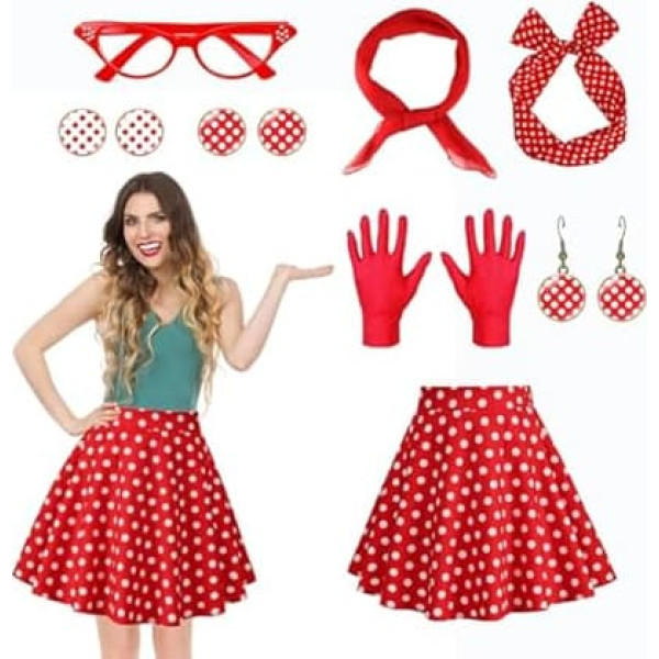 Product description Product description ● Stand out in the crowd: with our bright skirt red and white dots as the centrepiece, you will be unmissable at any event. Combine it with the matching accessories to create an eye-catching, harmonious look that is guaranteed to attract everyone's attention and leave a lasting impression. Effortless style for any occasion: whether you want to dress up for a theme party, attend a carnival or just add a touch of retro charm to your everyday look - with our women's rockabilly accessories, this is easy. The versatile pieces can be combined according to your personal style and ensure that you always look good. Complete the vintage look: Our women's carnival costume is designed to complement each other perfectly and create a harmonious vintage look that is both stylish and authentic. From the delicate bow headband to the sparkling earrings, each piece is designed to add a touch of elegance and sophistication to your ensemble. ● THE PERFECT GIFT FOR RETRO LOVERS: Do you know someone who loves vintage fashion and rockabilly style? Our 50s women's accessories are the perfect gift for any occasion. Whether it's a birthday, festival or just a nice surprise, the recipient will appreciate that you have thought about choosing a gift that appeals to their unique sense of style. Specification: Material: Chiffon, Plastic, Metal Package: 1 x skirt red white dots. 1 x headband. 1 x scarf. 2 x gloves. 1 x pair of glasses. 2 x earrings. 4 x dangling earrings. Safety Warning No; Product description Product description ● Stand out in the crowd: with our bright skirt red and white dots as the centrepiece, you will be unmissable at any event. Combine it with the matching accessories to create an eye-catching, harmonious look that is guaranteed to attract everyone's attention and leave a lasting impression. Effortless style for any occasion: whether you want to dress up for a theme party, attend a carnival or just add a touch of retro charm to your everyday look - with our women's rockabilly accessories, this is easy. The versatile pieces can be combined according to your personal style and ensure that you always look good. Complete the vintage look: Our women's carnival costume is designed to complement each other perfectly and create a harmonious vintage look that is both stylish and authentic. From the delicate bow headband to the sparkling earrings, each piece is designed to add a touch of elegance and sophistication to your ensemble. ● THE PERFECT GIFT FOR RETRO LOVERS: Do you know someone who loves vintage fashion and rockabilly style? Our 50s women's accessories are the perfect gift for any occasion. Whether it's a birthday, festival or just a nice surprise, the recipient will appreciate that you have thought about choosing a gift that appeals to their unique sense of style. Specification: Material: Chiffon, Plastic, Metal Package: 1 x skirt red white dots. 1 x headband. 1 x scarf. 2 x gloves. 1 x pair of glasses. 2 x earrings. 4 x dangling earrings. Safety Warning No; Product description ● Stand out in the crowd: with our bright skirt red and white dots as the centrepiece, you will be unmissable at any event. Combine it with the matching accessories to create an eye-catching, harmonious look that is guaranteed to attract everyone's attention and leave a lasting impression. Effortless style for any occasion: whether you want to dress up for a theme party, attend a carnival or just add a touch of retro charm to your everyday look - with our women's rockabilly accessories, this is easy. The versatile pieces can be combined according to your personal style and ensure that you always look good. Complete the vintage look: Our women's carnival costume is designed to complement each other perfectly and create a harmonious vintage look that is both stylish and authentic. From the delicate bow headband to the sparkling earrings, each piece is designed to add a touch of elegance and sophistication to your ensemble. ● THE PERFECT GIFT FOR RETRO LOVERS: Do you know someone who loves vintage fashion and rockabilly style? Our 50s women's accessories are the perfect gift for any occasion. Whether it's a birthday, festival or just a nice surprise, the recipient will appreciate that you have thought about choosing a gift that appeals to their unique sense of style. Specification: Material: Chiffon, Plastic, Metal Package: 1 x skirt red white dots. 1 x headband. 1 x scarf. 2 x gloves. 1 x pair of glasses. 2 x earrings. 4 x dangling earrings. Safety Warning No