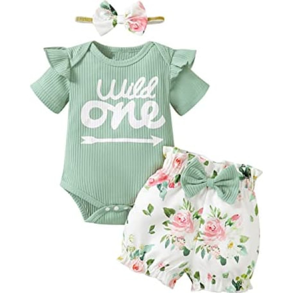 Truly One Wild One Girls Birthday Outfit Floral Print Top + Pants + Headband 3 Pieces Green Short 12-18 Months, Green-short, 12 - 18 months