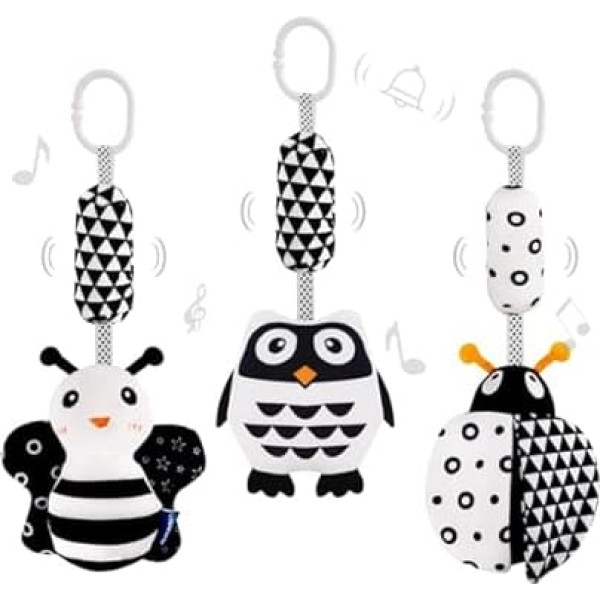 AIPINQI 3 Pieces Hanging Rattle Toys Cartoon White Black Stuffed Stroller Plush Toys for Newborn 0-18 Months Baby Cot Ladybird Bee Owl