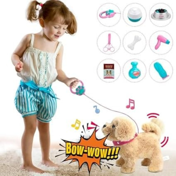 Interactive running dog toy with voice repetition: Are you still buying boring stuffed toys or dolls for your little girls and boys? Try our interactive talking Golden Retriever that walks, barks and wags its tail like a real puppy. This walking dog toy repeats everything you say and plays music. Your children will enjoy a realistic pet experience Plush 11-piece set: The package contains an electronic plush golden retriever dog with function, perfume, hair dryer, hair trimmer, scissors, bone, leash, food tray, baby bottle, snack box, instruction manual and screw pen. Enjoy the pleasure of grooming, feeding and walking the dog Good educational dog with lead that runs and barks: Your children will enjoy cleaning and playing with this electronic running dog, promoting responsibility and developing social and cognitive skills Safe for children: Made of safe, non-toxic material, it does not harm your children. Recyclable ABS plastic and high-quality soft plush. Perfect play toy set for girls and boys: If you have any problems, please feel free to contact us. This interactive dog toy is an adorable and comforting companion for children. Perfect gift toy for your boys and girls › See more product details