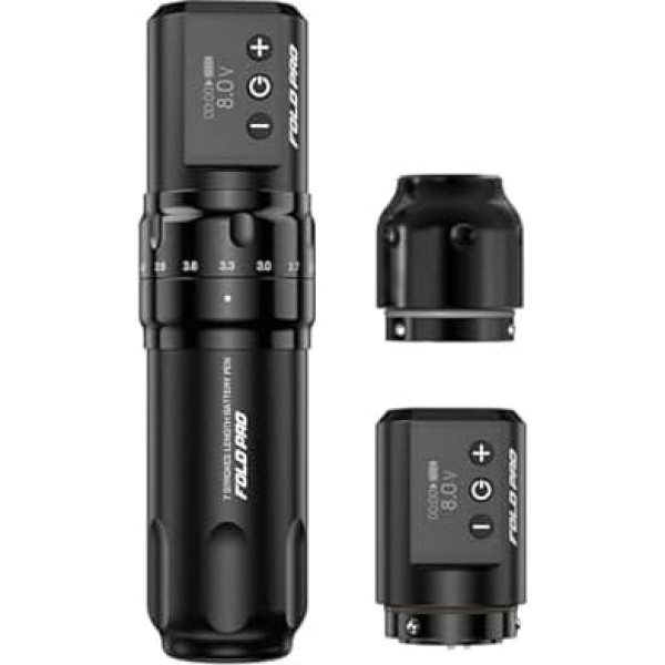 Dragonhawk Fold Pro wireless tattoo pen machine packaging including 2 batteries. Tattoo pen offers 7 strokes of 2.4 mm, 2.4 mm, 2.7 mm, 3.0 mm, 3.3 mm, 3.6 mm, 3.9 mm, 4.2 mm options, turning the adjustment knob changes the stroke and lets you tattoo in any style with ease Two modes for work: you can easily switch between removable RCA and wireless battery to enjoy the convenience of the machine. Fold Pro wireless battery pen style machine is equipped with a battery that gives you up to five hours of tattoos; the battery is also removable, so you can easily charge the battery Advanced Direct Drive System Latest advanced formulation by in-house artists and technicians results in strong cores. This tattoo machine professional advanced direct drive system that works smooth, precise, soft and quiet. Flexible for any style. Gently and gently transfers ink to the skin. Stable voltage and low noise give satisfied experience for you and your customers Motor Powerd By Mcore : fold pro wireless pen machine packed with Mcore-C2 motor, ultra power no-snag motor allows exceptional performance and durability and glides through the thickest skin without hanging or pulling, it makes the machine a good balance between lines and shades and perfect for tattoo, microblading and SMP Tattoo battery capacity: 1500 mAh battery capacity, takes 1.5 hours to full charge, runs for five hours. 4V-12V adjustable voltage. A visible LED indicator shows the working voltage, working time and remaining power. Supports long-term tattoo work and stable output Tattoo machine pen parameters: tattoo pen made of aluminium alloy frame and CNC carved. Length: 128 mm/5.04 inches, diameter: 32 mm/1.25 inches, weight: 199 g/7.02 oz. Easy to disassemble, maintain and replace replacement parts › See more product details