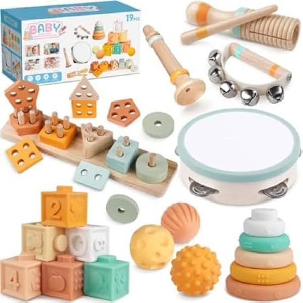 VIBRANT TOYS FOR CURIOUS HEADS: Support your child's natural learning development with our Montessori inspired toy collection! Includes 3 textured balls, 5 stacking rings, 6 building blocks, a 5x4 wooden shape sorter, 1 tambourine, 1 trumpet, 1 hand bell and 1 wooden bell with stick. Carefully crafted in soothing, neutral shades and made from 100% natural materials, this set is ideal for parents who care about safety and mindful play. LEARNING PLAY This set provides a lively sensory experience that awakens the child's natural curiosity. It promotes practical discovery while improving fine motor skills, creativity and problem-solving skills. With musical wooden toys that convey rhythm and sound, your child develops a love of music while strengthening hand-eye coordination and colour recognition. Neutral hues for lasting charm: this beautifully crafted toy set in soft, neutral colours will enhance any baby or playroom and inspire imaginative play. It perfectly complements other aesthetic baby items and creates a warm and stylish space for little explorers. These timeless toys have been carefully designed for parents who appreciate simplicity and natural aesthetics. They are an ideal gift and accompany your child through different stages of development. SAFE AND NON-TOXIC FOR A REALMING FEELING - Your baby's safety is our top priority. Each toy undergoes rigorous testing to meet the strictest safety standards and provide your little one with a safe playing environment. Our food grade silicone stacking blocks and rings are BPA and phthalate-free making them ideal for teething babies. Our natural wooden music toys are made from sustainably sourced wood and painted with organic water-based paints, ensuring safety and sustainability. GIFT OF ESSENCE The silicone sensory toys are designed for hours of play and bite resistant as well as drop proof. The wooden toys are designed for durability. A perfect gift for birthdays, Christmas, New Year, baby showers or family gatherings. Let your child discover the magic of natural curiosity as they learn, explore, and experience the wonders of our gender-neutral toddler toys. › See more product details