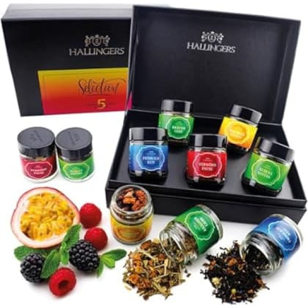 5 tasty tea blends from around the world Gourmet tea for tea filters, teapot, French press, calabash... or as iced tea; in aroma-dense mini glasses in elegant deluxe box; Hallinger's packaging designs are internationally awarded! Very rich quality tea, can be infused several times; high-quality coarse cut, hardly powdery Selected, natural raw materials, without preservatives, flavour enhancers and artificial colours A pleasure, ideal for giving as a gift and enjoying yourself. ALLERGENS: May contain traces of gluten and nuts. --- Note on primary ingredient(s): tea not from Bavaria/Germany › See more product details