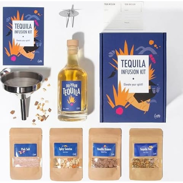 For flavours: with this tequila infusion set, you can easily flavour your own tequila. Set includes: wood chips (Vanilla Dream), salt (Pink Salt), 2 x hand-picked spice blends, a glass bottle, a metal strainer funnel, great cocktail recipes and 2 customisable labels. 【 Alcohol is not included in the set. 】 Best quality: Flavour your tequila with our selection of 100% natural spices, herbs and fruits. In addition to the hand-picked wood chips and salt, you can choose between Spicy Sunrise (orange peel, rosemary, jalapeño) or tequila tea (lemon peel, ginger and mint). First-class cocktails: give your cocktails a unique taste with our tequila infusion set. Discover our delicious cocktail recipes and create impressive drinks that will delight your friends and family. 100% natural: our DIY kits are handmade in Europe. All ingredients are of the highest quality and free from additives. Our DIY infusion sets are climate-neutral and are perfect for sustainable enjoyment. The perfect gift: for yourself and your loved ones. Our set is the ideal DIY gift set for men and women on any occasion: anniversary, birthday, wedding or Christmas. With this tequila gift set, you are always right. Cheers! › See more product details