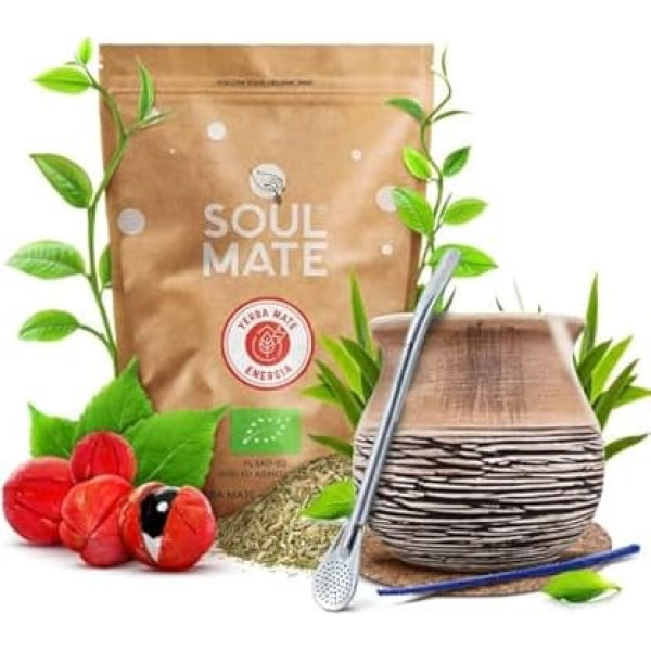 Yerba Mate Bio Energizing - Soul Mate Orgánica Energia is a 100% organic Yerba Mate without additives, rich in natural caffeine and antioxidants for long-lasting energy and better concentration. Ceramic calabash \; Product description Product description Immerse yourself in the world of mate tea with this complete set of Yerba Mate Soul Mate Orgánica Energia. This 100% organic yerba mate is smokeless dried and offers a mild, balanced flavor rich in natural caffeine and antioxidants. It provides a long-lasting energy boost without the negative effects of coffee. This premium set contains: ✔ A ceramic calabash \; Product description Product description Immerse yourself in the world of mate tea with this complete set of Yerba Mate Soul Mate Orgánica Energia. This 100% organic yerba mate is smokeless dried and offers a mild, balanced flavor rich in natural caffeine and antioxidants. It provides a long-lasting energy boost without the negative effects of coffee. This premium set contains: ✔ A ceramic calabash \; Product description Immerse yourself in the world of mate tea with this complete set of Yerba Mate Soul Mate Orgánica Energia. This 100% organic yerba mate is smokeless dried and offers a mild, balanced flavor rich in natural caffeine and antioxidants. It provides a long-lasting energy boost without the negative effects of coffee. This premium set contains: ✔ A ceramic calabash \