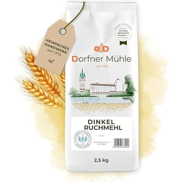 The Dorfner Mühle in Straubing in Lower Bavaria has been grinding regional cereals from the nutrient-rich Gäuboden since 1376. We have been supplying and working with small and medium-sized bakeries for many generations. Spelt smoke flour type 1100 is a traditional flour bread flour and has more mineral and fibre than (half) white flour. The flour is made from 100% spelt without additives. Traditional flour for rustic breads and mixed breads, rolls, Swiss Bürli as well as savoury and spicy cakes. Contact us at any time for our traditional bread baking recipes. Best raw materials, without additives or industrial substances of any kind. › See more product details; Product description Product description The smoke flour lies between a semi-white flour (e.g. type 550 and 812) and a whole grain flour. \; Product description Product description The smoke flour lies between a semi-white flour (e.g. type 550 and 812) and a whole grain flour. \; Product description The smoke flour lies between a semi-white flour (e.g. type 550 and 812) and a whole grain flour. \