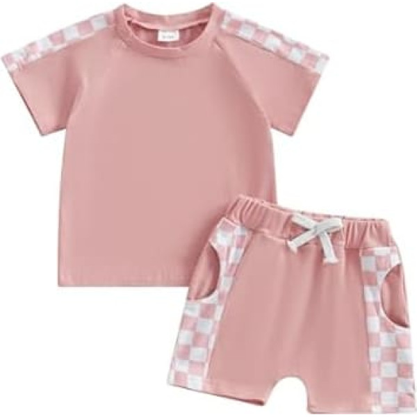 Toddler Baby Boy Spring Summer Outfits Short Sleeve Contrast Color T-Shirt Sweatshirt Top with Elastic Waist Plaid Shorts Sets 2 Pieces Clothes for Little Boys (Pink, 2-3 Years),, rose