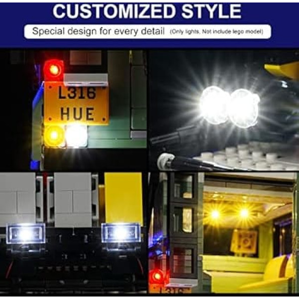 Designed for Lego 10317: the light kit is specially used for lighting Lego 10317 Land Rover Classic Defender 90 set and makes it more realistic and unique (Lego models are not included, only the lighting kit) High quality and easy to hide - The bricks for connecting LED lights are from LEGO original, 2 mm tiny wire is easy to hide, which does not affect the look of your building model. Safety and USB powered: the built-in resistor in the light kit can prevent the light from overheating and burning. You can connect the USB cable to a battery box, power bank, laptop, USB socket or wall adapter An excellent gift and great for creativity: the light set is an excellent gift for kids who have Lego blocks or for Lego fans. It is a great way for creativity as it is a DIY style to light up your building blocks. Installation instructions (easy to install): comes with an electronic instruction (with video and photos) to guide you step by step. Please install your LED light carefully, no over-pulling, bending or shaking to avoid damage. If you have any questions, please do not hesitate to contact us via Amazon. › See more product details
