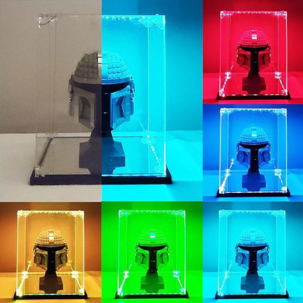 Coloured Lighting and Mirror Base Acrylic Display Case Box Compatible with Lego Helmet 8 x 8 x 10 Inches (20 x 20 x 25 cm), for 75328, 75304, 75349, (Does Not Include Building Block Model) (Colour)