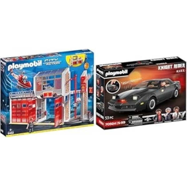Product 1: Fun for little firefighters: PLAYMOBIL large fire station with 3 figures, accessories and cool sound effects for detailed replay Product 1: hinged garage doors, helicopter with landing siren, slide bar and much more, space for 2 vehicles, expandable with fire brigade truck (9466) Product 1: toy figure set for children from 5 years: ideal for children's hands due to age-appropriate size and pleasant feel with rounded edges Product 1: daily play: instructions for assembling together with parents, high-quality and robust design, cleaning the parts (without stickers) under running water without chemical agents Product 2: The legendary miracle car from the 80s hit series: PLAYMOBIL Knight Rider - K.I.T.T. With electronic features, 3 series figures and scenery Product 2: light and sound module with welcome, farewell and 6 other electronic feature sequences with running light and voice of the Knight Rider car Product 2: removable roof, rotating number plate, folding headlights and much more, with main character Michael Knight, Devon Miles and Bonnie Barstow Product 2: K.I.T.T. Toy car for children from 5 years or collectible car for adults, high-quality and robust design, cleaning the parts (without stickers) under running water without chemical agents › See more product details