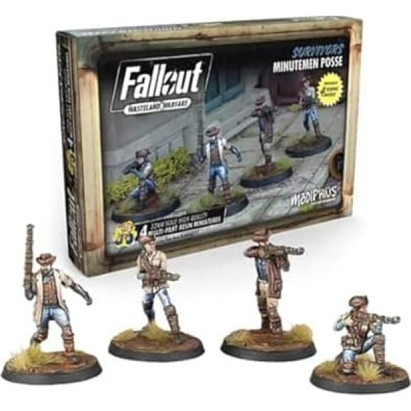 EXPAND YOUR FACTION: Enhance your Fallout: Wasteland Warfare experience with this set featuring three unique Survivor characters. Expand your faction's roster and discover new strategies as you navigate the post-apocalyptic wasteland. VERSATILE GAMEPLAY: This set introduces new cards tailored for both player vs player and AI game modes. Dive into thrilling battles with friends or challenge the AI, experiencing the versatile and engaging gameplay of Fallout: Wasteland Warfare. IMMERSIVE WARGAMING: Immerse yourself in the wasteland with high-quality 32 mm scale resin miniatures and iconic scenery pieces. From the Red Rocket to Sanctuary Hills, explore a vast array of detailed settlement buildings, Nuka-Cola vending machines, and wrecked cars, creating an authentic and visually stunning gaming experience. PREMIUM RESIN MINIATURES: Dive into the post-apocalyptic world of Fallout with four meticulously crafted 32mm scale high-quality multi-part resin miniatures, complete with a scenic bases, offering unparalleled detail and realism for your tabletop adventures. YOUR CANVAS, YOUR CREATIVITY: With some assembly required and supplied unpainted, these miniatures provide the perfect canvas for your artistic expression. Unleash your creativity as you assemble, paint, and customize these Raiders, bringing them to life in your unique vision of the Wasteland. › See more product details; Product description Product Description The Minutemen are here to save the settlement! This Fallout: Wasteland Warfare set contains 32 mm scale high-quality multi-part resin miniatures with scenic bases. Requires some assembly. Supplied unpainted. Each set provides an expansion to your game with new cards for player vs player and AI game modes. Safety Warning not_applicable; Product description Product Description The Minutemen are here to save the settlement! This Fallout: Wasteland Warfare set contains 32 mm scale high-quality multi-part resin miniatures with scenic bases. Requires some assembly. Supplied unpainted. Each set provides an expansion to your game with new cards for player vs player and AI game modes. Safety Warning not_applicable; Product Description The Minutemen are here to save the settlement! This Fallout: Wasteland Warfare set contains 32 mm scale high-quality multi-part resin miniatures with scenic bases. Requires some assembly. Supplied unpainted. Each set provides an expansion to your game with new cards for player vs player and AI game modes. Safety Warning not_applicable