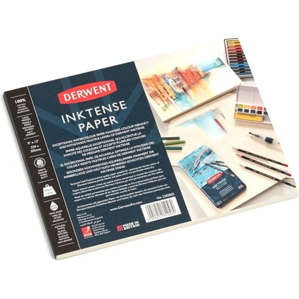 Derwent Inktense paper pad: format 229 x 305 mm, 20 sheets of high-quality 300 g/m² natural white, acid-free artist paper, for sketching, painting, drawing, colouring and designing TEXTURED FINISH Cold-pressed archival quality paper that preserves the vibrant colors of Derwent Inktense pens, blocks and colors that are permanent once dry VERSATILE PAPER SHEETS The paper is ideal for better control of watercolor techniques and optimizes Inktense's premium performance to highlight the vibrant colors. MADE IN BRITAIN - Made from 100% cotton without optical brighteners for a long lasting colour, surface designed for strength and resistant to moisture, fraying and shining through Contents: 1 x 229 x 305 mm Inktense textured watercolour paper, natural white, 20 sheets, glued to the short edge › See more product details
