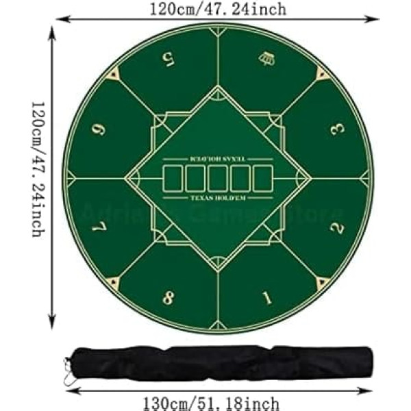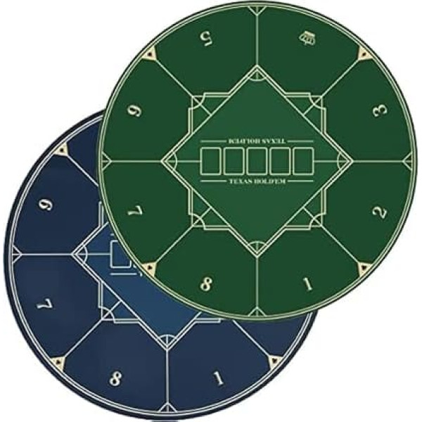 NON-SLIP RUBBER BASE: The rubber base holds the desk firmly and ensures stability when the game is at the crucial moment. In addition, the herringbone structure on the bottom increases friction and does not affect the dealing of the cards when playing. Casino poker layout: poker table tops offer a poker layout to improve the game and can be placed on an existing table. The table top you would expect on a standard poker table, but without legs. It is designed to stand on your dining table and is commonly referred to as the \; Product description Description: 1. POKER TABLE TOP LAYOUT: This poker mat can turn any table into a professional poker game in seconds. Its size ensures that no is excluded from the game wherever you play. 2. EASY TO CLEAN: Just Shake It or Use a Cloth. Protect your desk from splatters while playing games, keep dirt outside, and provide traction wet on . 3. Enjoy Poker Night: Round poker mat with bet line made of Multi-spandex Fabric. Change your round dining table in seconds into a super poker table with this handy poker mat. Because the poker mat is made of rubber you can shuffle the poker cards real easy, deal the cards real smoothly, and play with your chips like you are playing poker at a real poker table. Specifications: Name: Poker Mat Rubber and multi-pandex. Colour: blue, green. Thickness of rubber: 2 mm. Unfolded Dimensions: 120 x 120 x 0.2cm/47.24 x 47.24 x 0.08inch Scope of use: table cover poker, card games, board games, tile games, dominoes. Scenes to be used: Poker Games, Casino, Theme Party, Poker Night, Fundraisers & Gatherings Package: 1 x Texas Hold'em tablecloth. 1 x Oxford bag. Note: 1. Please allow slight inaccuracy due to manual measurement, make sure that you do not mind before you order. 2. Due to the lighting effect and shooting angle, the colors may have differences from the product, please understand.; Product description Description: 1. POKER TABLE TOP LAYOUT: This poker mat can turn any table into a professional poker game in seconds. Its size ensures that no is excluded from the game wherever you play. 2. EASY TO CLEAN: Just Shake It or Use a Cloth. Protect your desk from splatters while playing games, keep dirt outside, and provide traction wet on . 3. Enjoy Poker Night: Round poker mat with bet line made of Multi-spandex Fabric. Change your round dining table in seconds into a super poker table with this handy poker mat. Because the poker mat is made of rubber you can shuffle the poker cards real easy, deal the cards real smoothly, and play with your chips like you are playing poker at a real poker table. Specifications: Name: Poker Mat Rubber and multi-pandex. Colour: blue, green. Thickness of rubber: 2 mm. Unfolded Dimensions: 120 x 120 x 0.2cm/47.24 x 47.24 x 0.08inch Scope of use: table cover poker, card games, board games, tile games, dominoes. Scenes to be used: Poker Games, Casino, Theme Party, Poker Night, Fundraisers & Gatherings Package: 1 x Texas Hold'em tablecloth. 1 x Oxford bag. Note: 1. Please allow slight inaccuracy due to manual measurement, make sure that you do not mind before you order. 2. Due to the lighting effect and shooting angle, the colors may have differences from the product, please understand.; Description: 1. POKER TABLE TOP LAYOUT: This poker mat can turn any table into a professional poker game in seconds. Its size ensures that no is excluded from the game wherever you play. 2. EASY TO CLEAN: Just Shake It or Use a Cloth. Protect your desk from splatters while playing games, keep dirt outside, and provide traction wet on . 3. Enjoy Poker Night: Round poker mat with bet line made of Multi-spandex Fabric. Change your round dining table in seconds into a super poker table with this handy poker mat. Because the poker mat is made of rubber you can shuffle the poker cards real easy, deal the cards real smoothly, and play with your chips like you are playing poker at a real poker table. Specifications: Name: Poker Mat Rubber and multi-pandex. Colour: blue, green. Thickness of rubber: 2 mm. Unfolded Dimensions: 120 x 120 x 0.2cm/47.24 x 47.24 x 0.08inch Scope of use: table cover poker, card games, board games, tile games, dominoes. Scenes to be used: Poker Games, Casino, Theme Party, Poker Night, Fundraisers & Gatherings Package: 1 x Texas Hold'em tablecloth. 1 x Oxford bag. Note: 1. Please allow slight inaccuracy due to manual measurement, make sure that you do not mind before you order. 2. Due to the lighting effect and shooting angle, the colors may have differences from the product, please understand.