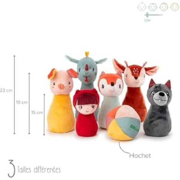 A magical bowling game: With Joe the Dragon, Stella the Fawn and her friends from the forest, the baby gently discovers the joys of bowling game! These cute cones are perfect for having fun and developing its coordination in complete safety. A fun sound ball: the ball of this bowling game is a real feast for the little ones. Thanks to its built-in rattle, it jingles cheerfully with every throw and makes the game even more exciting and fun for your baby. FUNNY CHARACTERS Each cone represents a figure with loving details: small ears, funny snout, tongue hanging out. Their soft shape and texture encourage baby to play and handle them with joy. DEVELOPMENT OF MOTOR SKILLS This fabric cone game helps your child develop their coordination and fine motor skills. By throwing the ball and knocking over the cones, your baby learns to control his movements in a playful way. The brand for little extras: Lilliputiens is made with care in Belgium and creates innovative, playful and fun toys. Choose a toy that grows with your Schnucki and gives him unforgettable moments of play. › See more product details; Product description Product Description Are you ready for a magical bowling game in the heart of the forest? This fabric cone set is perfect for toddlers aged 18 months and up and consists of a sound ball and 6 fun cones. With his friends from the forest, your child will have a lot of fun throwing and will become the future bowling star! Join Joe, the Dragon, Stella, the Fawn, Louis, the Wolf, Alice, the Vixen, Little Little Little Pig for wild games. The shape, size and weight of the cones are specially designed for little hands. Who manages to knock over this cheerful gang of friends with a single throw? The ball of this Lilliputiens skittles game hides a rattle inside. She jingles cheerfully as she rolls, approaches her destination, and ... boom! With this fabric skittles game, your child develops their coordination and motor skills at their own pace. It can play safely in the home. Each figure has fun details such as small ears, horns, a funny snout or a tongue hanging out. Not to mention her soft fur and supple body. So, ready to play? Safety Warning No warning applicable; Product description Product Description Are you ready for a magical bowling game in the heart of the forest? This fabric cone set is perfect for toddlers aged 18 months and up and consists of a sound ball and 6 fun cones. With his friends from the forest, your child will have a lot of fun throwing and will become the future bowling star! Join Joe, the Dragon, Stella, the Fawn, Louis, the Wolf, Alice, the Vixen, Little Little Little Pig for wild games. The shape, size and weight of the cones are specially designed for little hands. Who manages to knock over this cheerful gang of friends with a single throw? The ball of this Lilliputiens skittles game hides a rattle inside. She jingles cheerfully as she rolls, approaches her destination, and ... boom! With this fabric skittles game, your child develops their coordination and motor skills at their own pace. It can play safely in the home. Each figure has fun details such as small ears, horns, a funny snout or a tongue hanging out. Not to mention her soft fur and supple body. So, ready to play? Safety Warning No warning applicable; Product Description Are you ready for a magical bowling game in the heart of the forest? This fabric cone set is perfect for toddlers aged 18 months and up and consists of a sound ball and 6 fun cones. With his friends from the forest, your child will have a lot of fun throwing and will become the future bowling star! Join Joe, the Dragon, Stella, the Fawn, Louis, the Wolf, Alice, the Vixen, Little Little Little Pig for wild games. The shape, size and weight of the cones are specially designed for little hands. Who manages to knock over this cheerful gang of friends with a single throw? The ball of this Lilliputiens skittles game hides a rattle inside. She jingles cheerfully as she rolls, approaches her destination, and ... boom! With this fabric skittles game, your child develops their coordination and motor skills at their own pace. It can play safely in the home. Each figure has fun details such as small ears, horns, a funny snout or a tongue hanging out. Not to mention her soft fur and supple body. So, ready to play? Safety Warning No warning applicable
